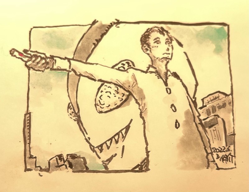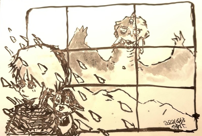 「シンウルトラマン」の最初にですね、いろんなウルトラオマージュ怪獣が出てくるんですよね。その影響で、ビデオに録画している「ウルトラQ」をみたわけです。南極基地でペギラが出てくると言うあの有名な話を見て、その絵を描こうと思ってペギラの絵を描きました。それで勢いつけてやっぱりウルトラマンも1枚と思ったわけです。